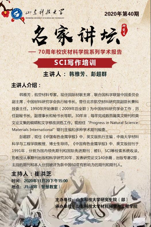 上一条:【70周年校庆系列学术报告】韩雅芳、彭超群教授应邀来山东科技大学材料... 下一条:2020年青年学者泰山国际论坛山东科技大学材料学院分论坛成功举办